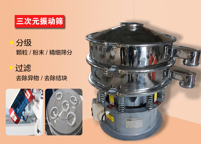 三次元振动筛又称三次元旋振筛,是由立式振动电机、底座、筛框、筛网组成的用于粉末、颗粒、浆液类物料筛分、除杂、过滤工作,由于其体积小、筛分精度高等特点一直是食品、医药、化工 ...
