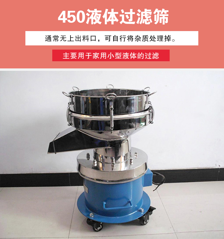 1、首先是小型号的450液体过滤筛,这种过滤筛主要用于家用小型液体的过滤,通常无上出料口,上层杂质需要过一段时间取下筛框,自行将杂质处理掉。如使用在产量较小的豆浆过滤上。