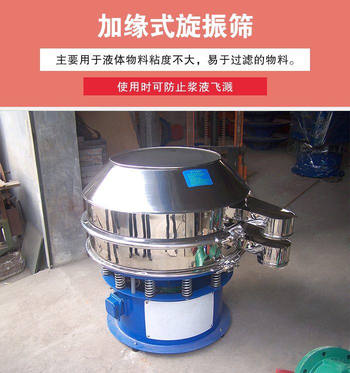 2、其次是普通的加缘式旋振筛,该型号的过滤筛主要用于液体物料粘度不大,易于过滤的情况,如果汁过滤,为了防止浆液物料在筛分的过程中飞溅,常常需要在上框设计成加高10cm,电机采用的是四级电机,电机转速是1440r/min。该旋振筛可以筛分的种类较多,粉类,颗粒类,浆液类物料均可使用,防止浆液飞溅,网架结构下面的弹跳球可以酌情省去。