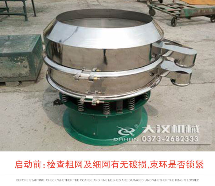 1.启动前:1.检查粗网及细网有无破损 2.每一组束环是否锁紧 振动筛